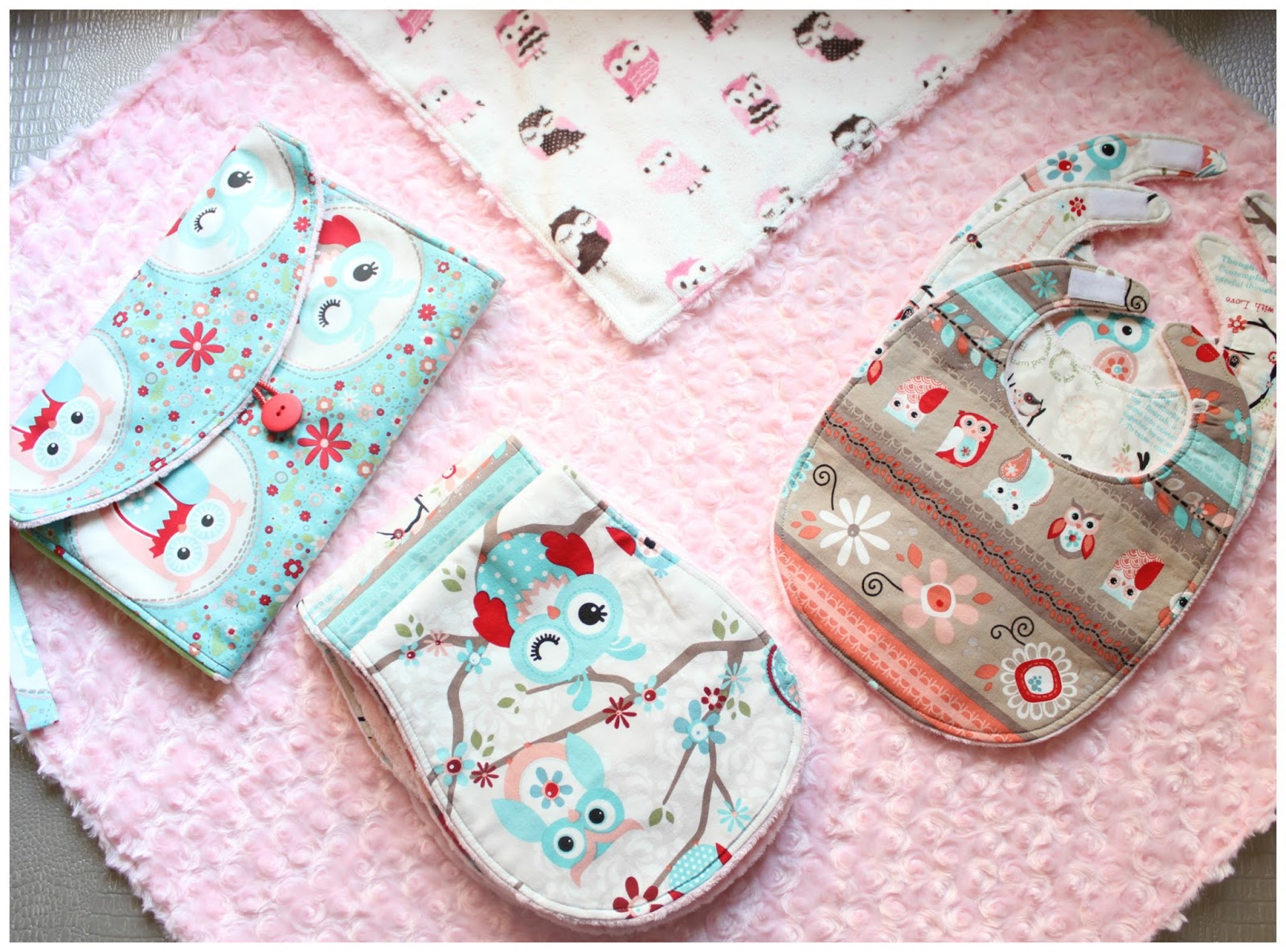 4 Tutoriales de accesorios para bebé: toallas de eructar, baberos, cambiador y manta. Todos ellos confeccionados con tela minky y algodón. Tutorial sobre cómo envolverlos y cómo hacer un lazo perfecto con cinta de raso.