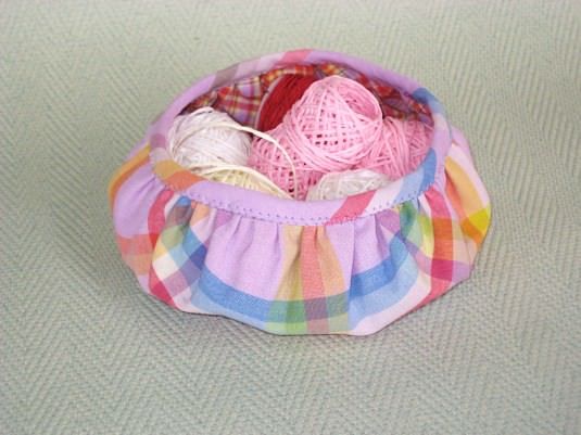 Instrucciones con fotografías del paso a paso para hacer un cestito utilizando retales de tela.